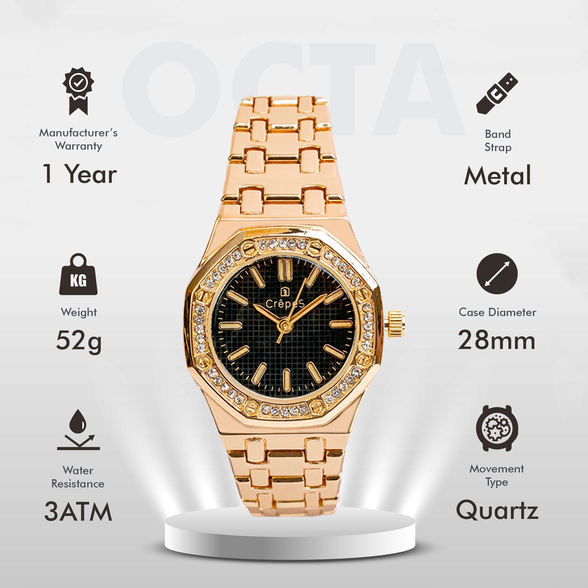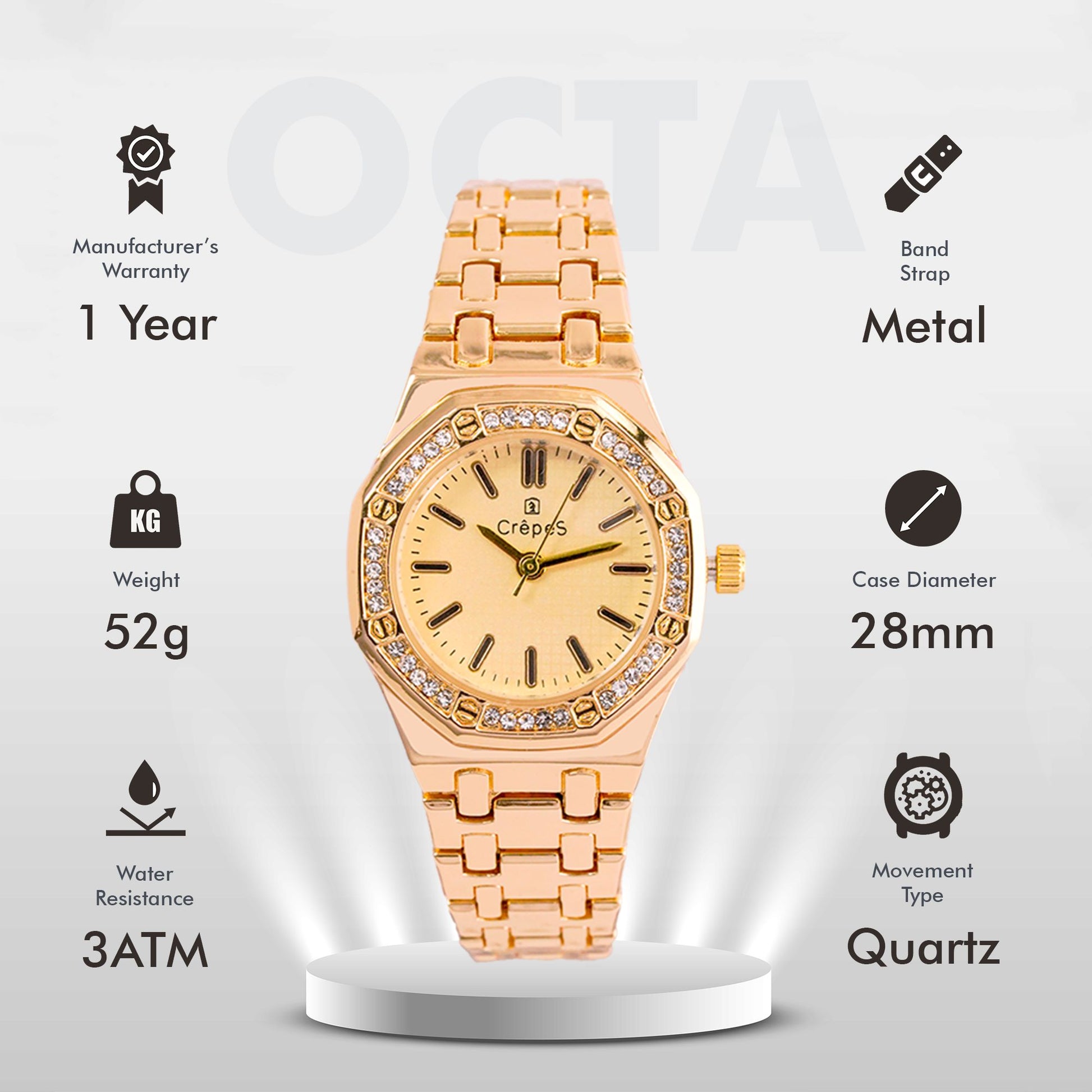 The CrêpeS Octa is a captivating interplay of geometry. The dial sits within a unique octagonal case, a shape that's both modern and sophisticated. Delicate stones shimmer on the dial, adding a touch of glamour. The gold metal strap ties the look together, creating a truly eye-catching timepiece. The CrêpeS Octa is a conversation starter for the woman who isn't afraid to be different.