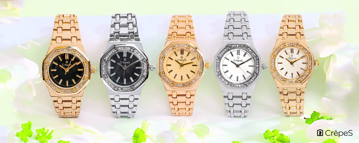 The CrêpeS Octa is a captivating interplay of geometry. The dial sits within a unique octagonal case, a shape that's both modern and sophisticated. Delicate stones shimmer on the dial, adding a touch of glamour. The gold metal strap ties the look together, creating a truly eye-catching timepiece. The CrêpeS Octa is a conversation starter for the woman who isn't afraid to be different.
